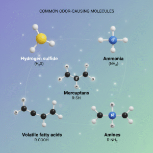 True odour neutralization requires a deeper understanding of the chemical reactions involved. Odours aren’t random—they are caused by identifiable molecules such as: